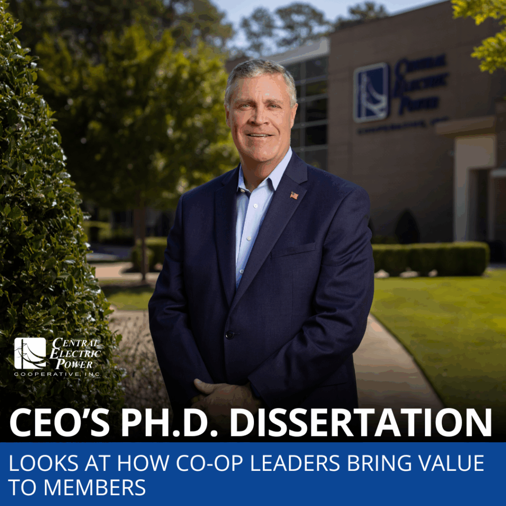 The formal title of Hochstetler’s dissertation is “The Value of Steward Leadership in Electric Cooperatives Using Constructivist Grounded Theory. Novel Theory: Cooperative CEOs in NRECA’s Region 2.” He spent nearly four years on the project and interviewed 19 executives of G&Ts and distribution co-ops in Georgia, Florida and South Carolina.
